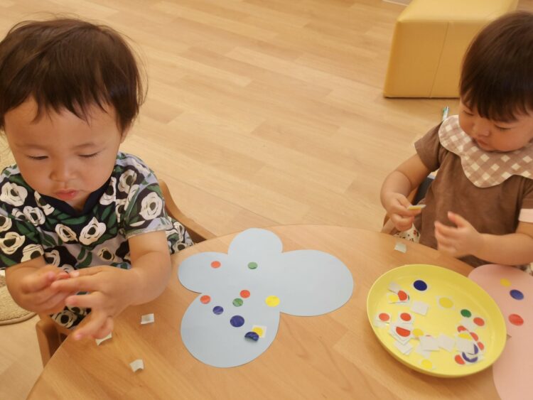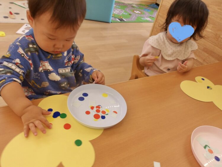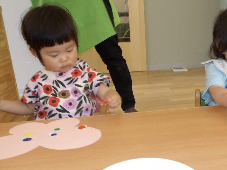 小さい台紙からシールを剥がすのはちょっぴり大変でしたが、みんなすごく集中しながら頑張っていました![]()