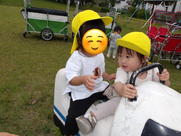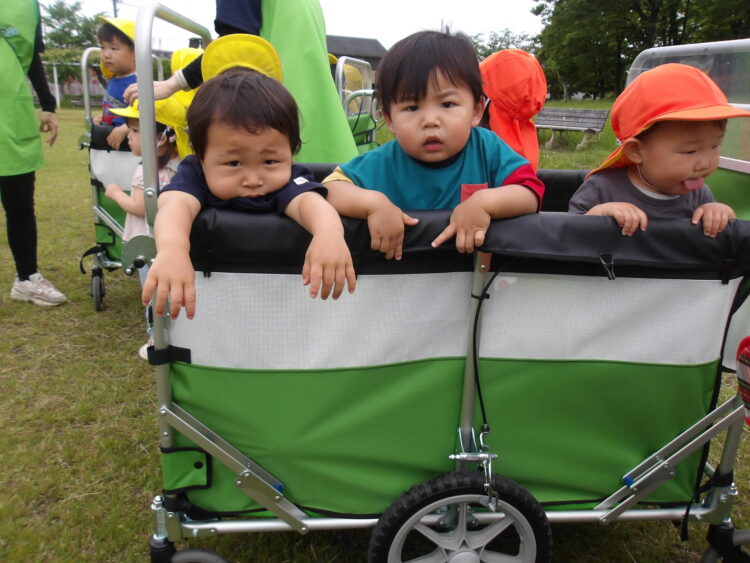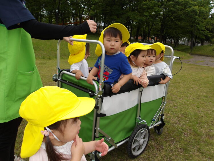 あひるぐみさん、うさぎぐみさんはカートに乗り、揃って長塚公園にお散歩に行ってきました![]()