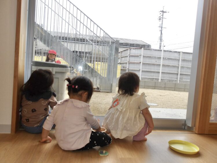 窓辺に集まり、園庭で遊んでいるお兄さん、お姉さんたちを観察![]()
