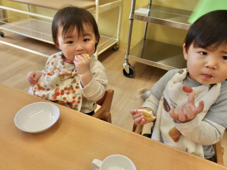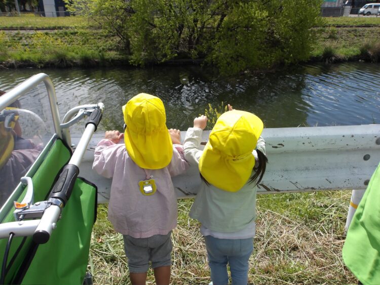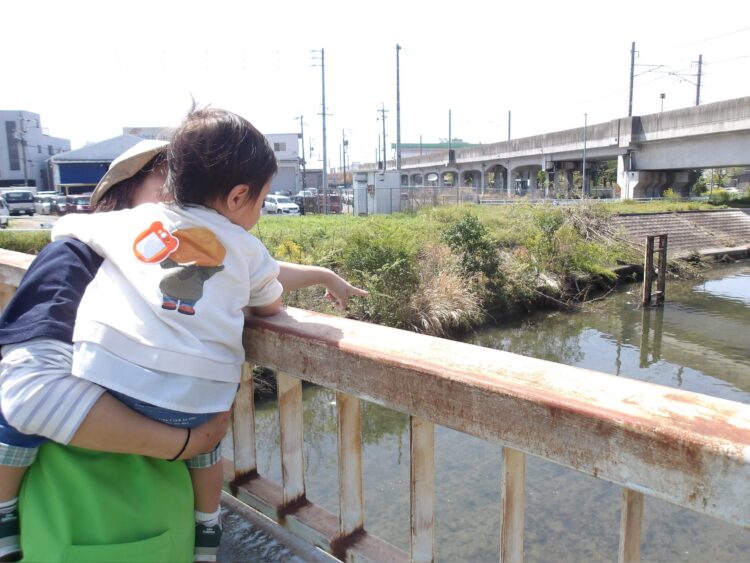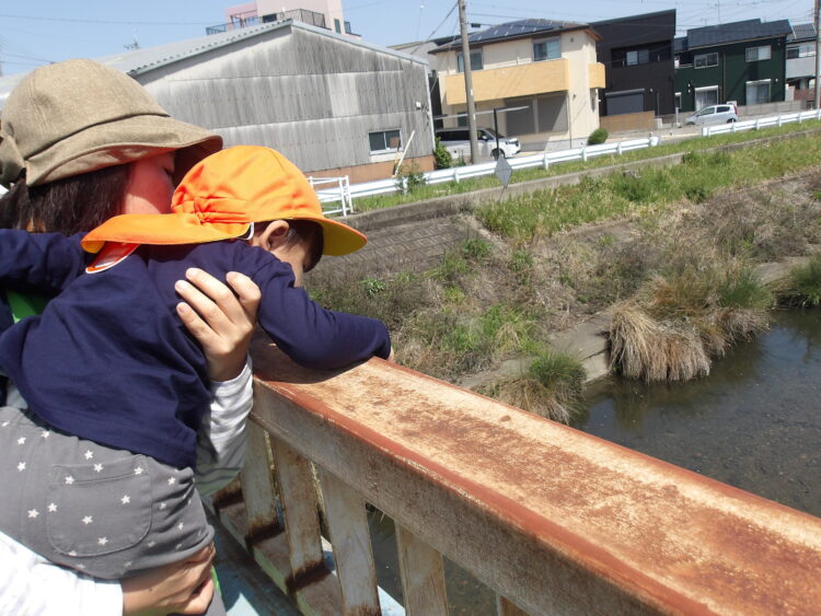 今日も、あひる組とうさぎ組で一緒に散歩にでかけました。園を出て、園の前で工事をしている人達に手を降りながら出発。さっそく近くの橋へ。