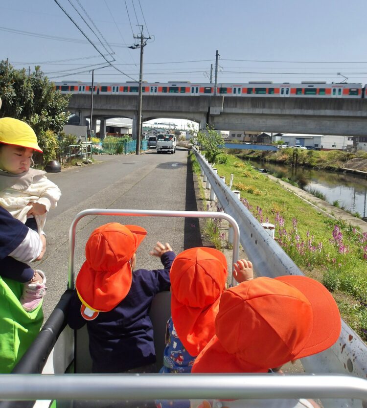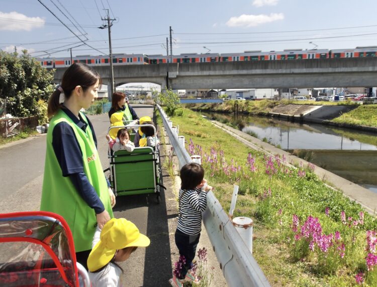 川沿いは綺麗な花も咲いていて、みんなの好きな電車も見れました。今日は、ジェット機やセスナなどの飛行機も見ることができました!