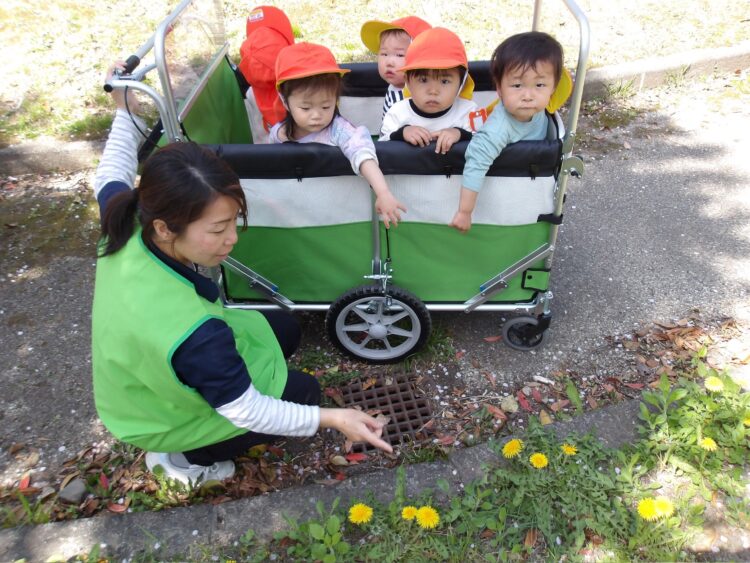 電車を見て、タンポポや桜の花びらを観察しましたよ![]()