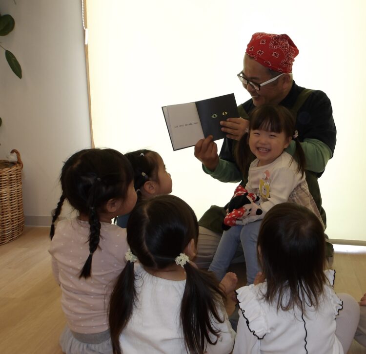 園長先生に絵本を読んでもらい、にこにこの子どもたちです![]()