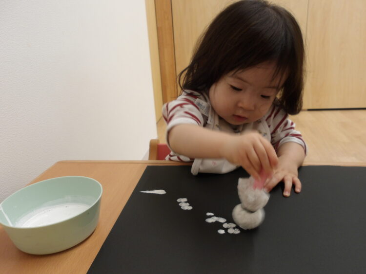 紙に押すことよりもタンポが気になり手でむにゅむにゅと触って感触を確かめている子もいました![]()