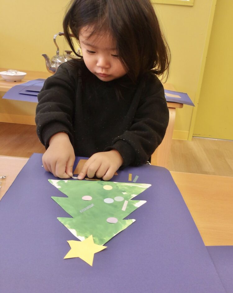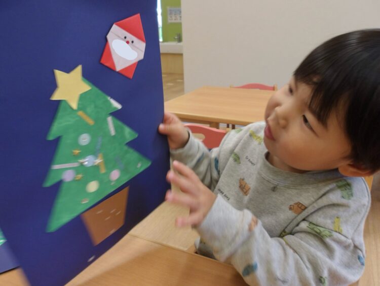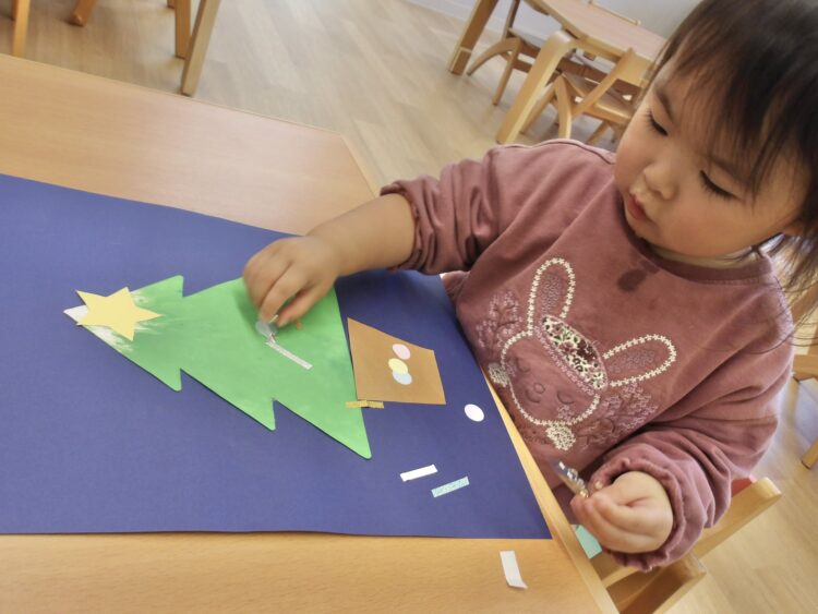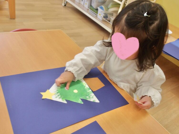 今日のあひる組さんは、先日フィンガーペインティングで作ったクリスマスツリーに飾り付けをしました!