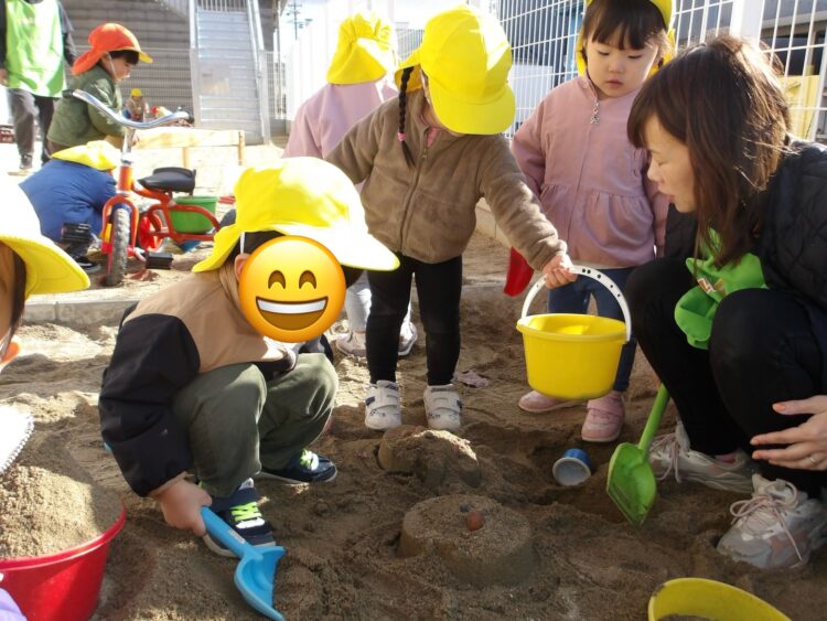 結局、虫は見つからなかったものの、お砂場遊びに変更し、お山作りや穴掘りに夢中になっていました![]()
