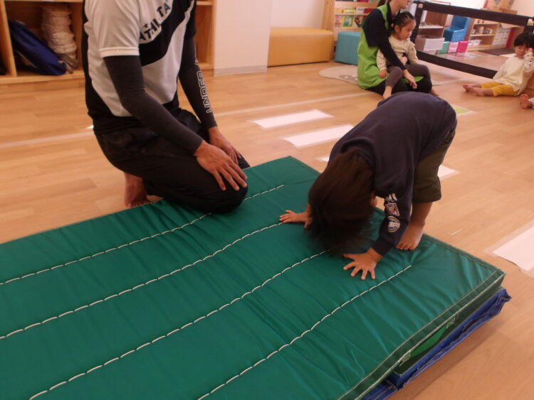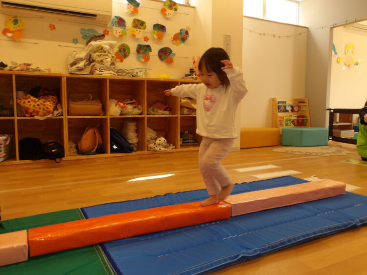 マットの上での平均台は不安定なのでバランスをとりながら渡っていましたよ😄