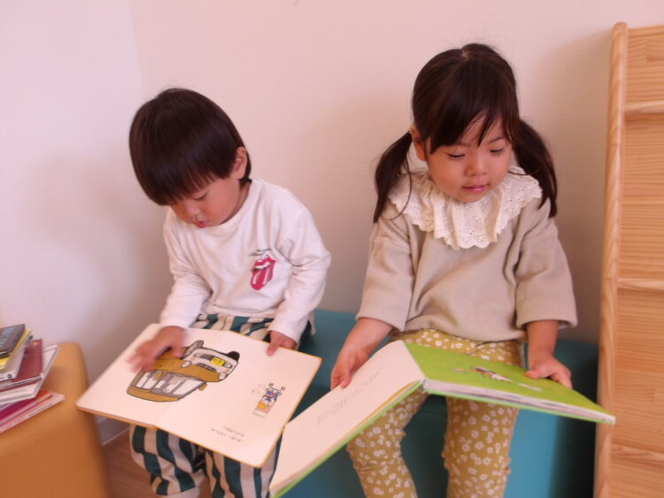 「せんせいもほんよむー?」と司書さんになりきっていました![]()