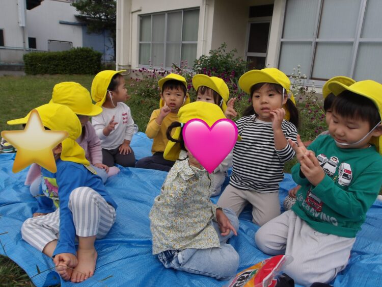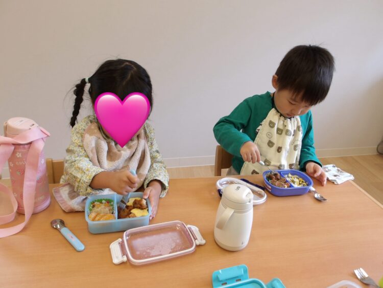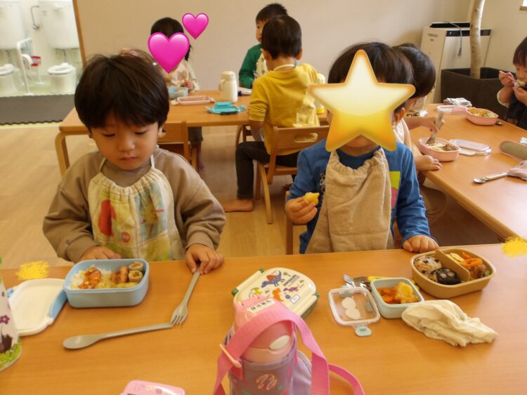 「唐揚げ入ってるー!卵焼きハート!みてみてー!」とお弁当箱やレジャーシート、お弁当の中身を嬉しそうに出して見せ合いして楽しくお弁当タイム🎶