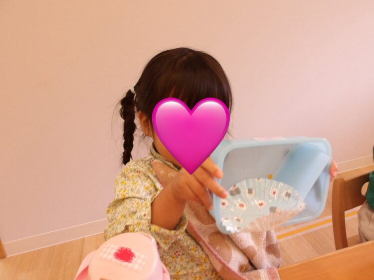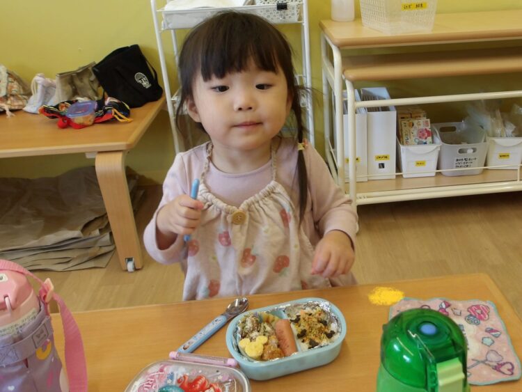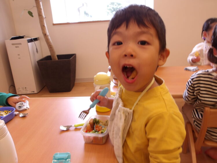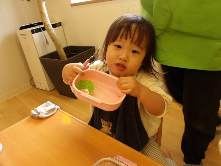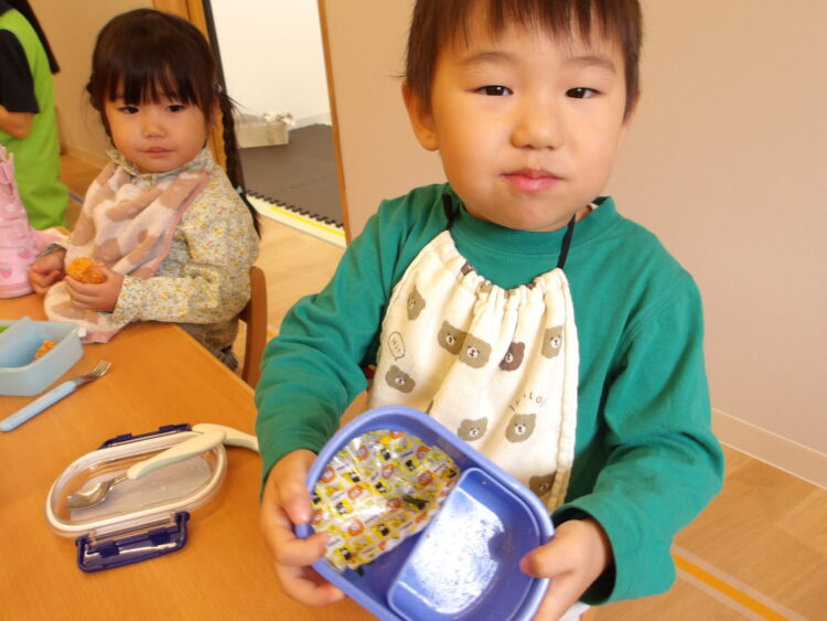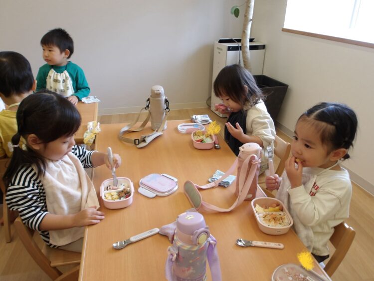 「お弁当の時間だよー!」の声でみんな「やったー!」と走ってカバンの元へ!