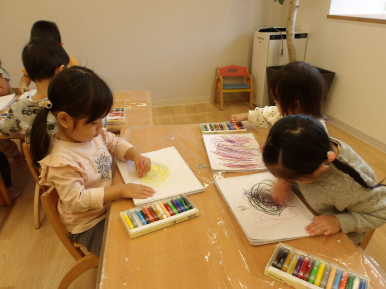 「虹」を描いたり、「レッカー車」を描いて出来上がると保育士に見せてくれます✨クレヨンの使い方に慣れ、ダイナミックに描くようになりました🎵