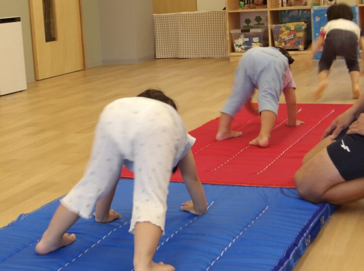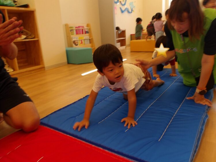 初めてお友だちとくっつきながら回転するマット運動に挑戦しました!
