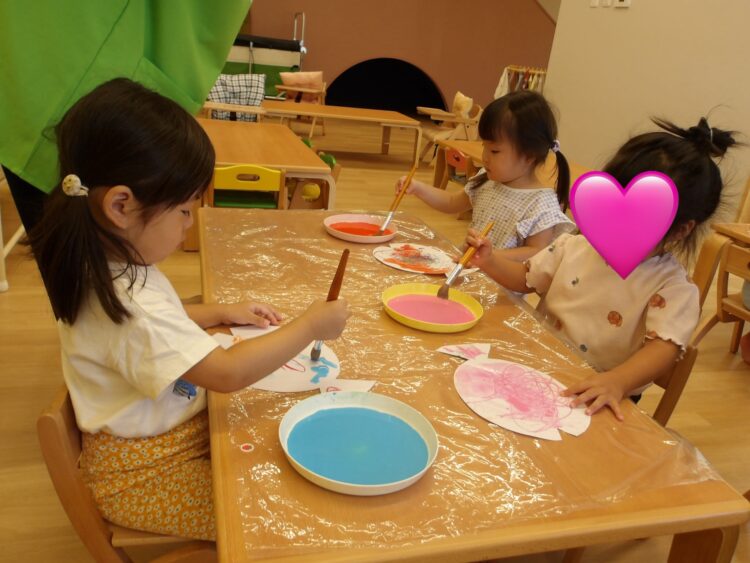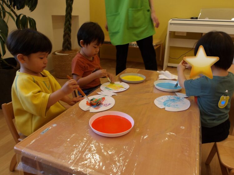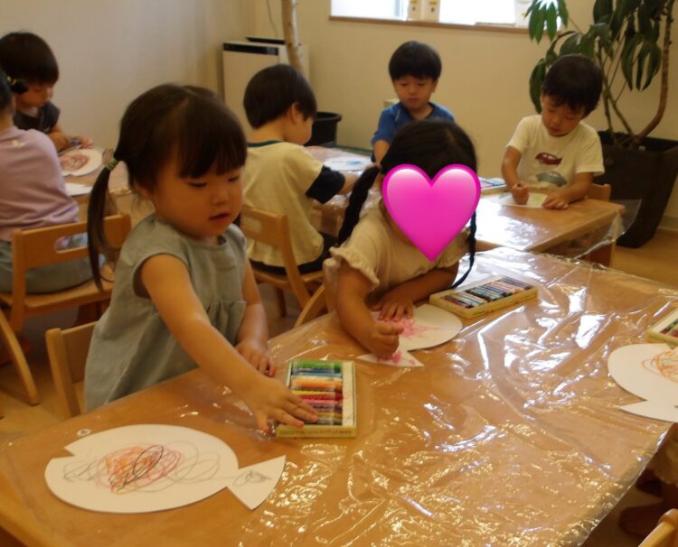 測定後は、昨日クレヨンで模様を描いたお魚さんに、絵の具を使ってはじき絵をしました![]()