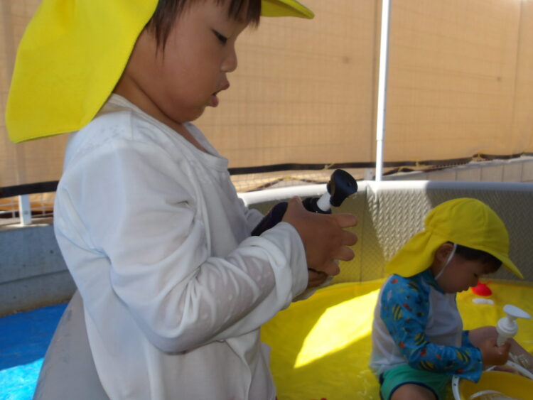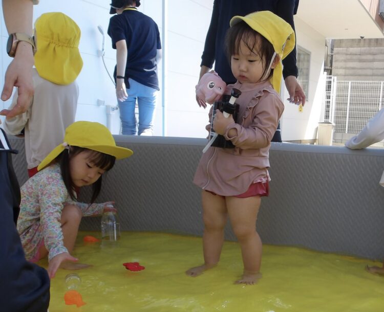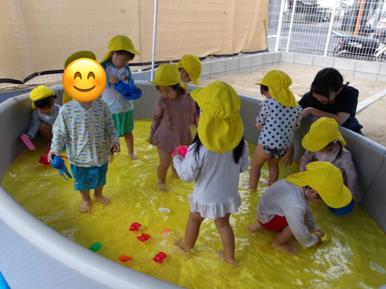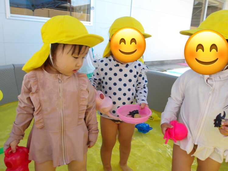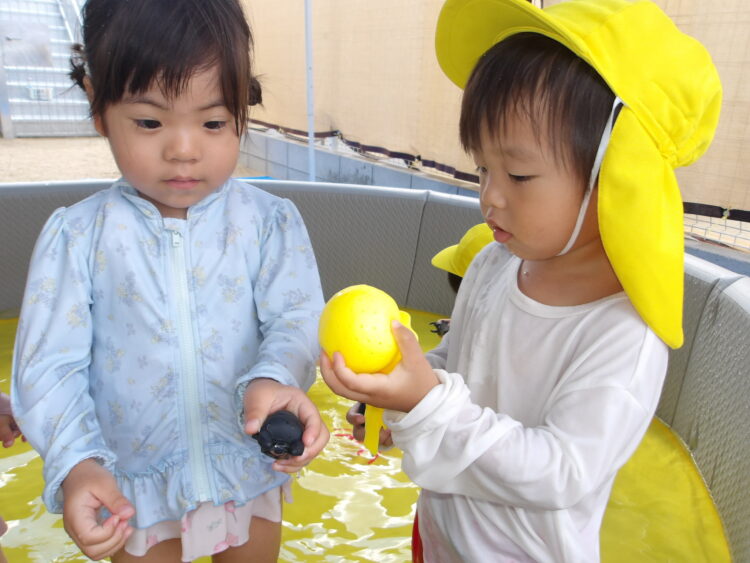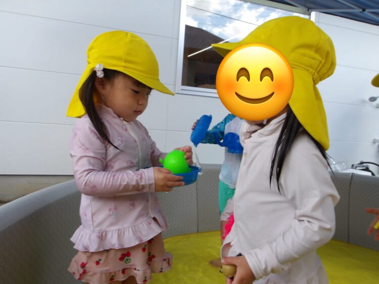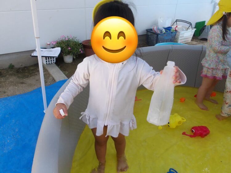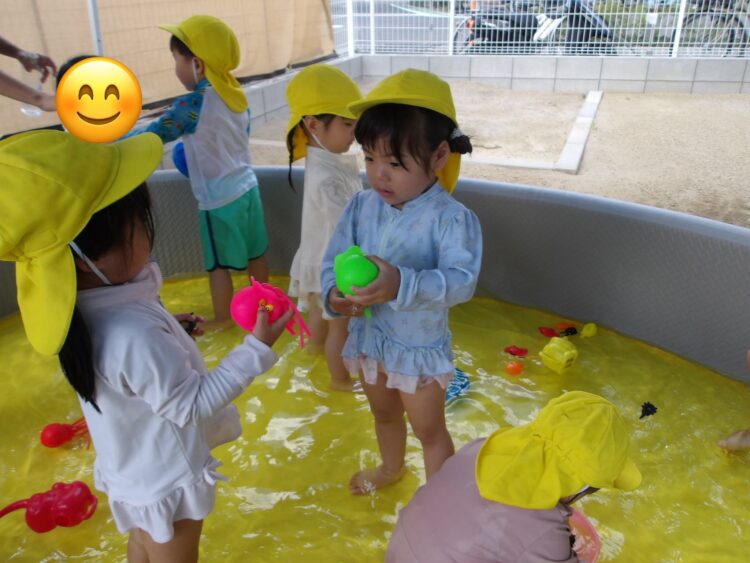 水で浮かぶラッコの泳ぎをして水風船を食べ物に見立てて遊ぶお友達もいましたよ😄🦦