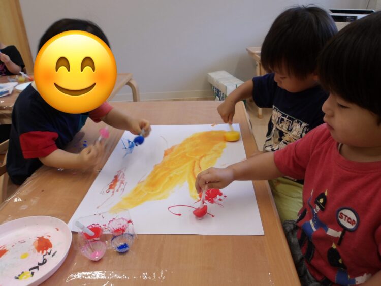 大きめの画用紙にお友だちと一緒に描いてるよ![]()
