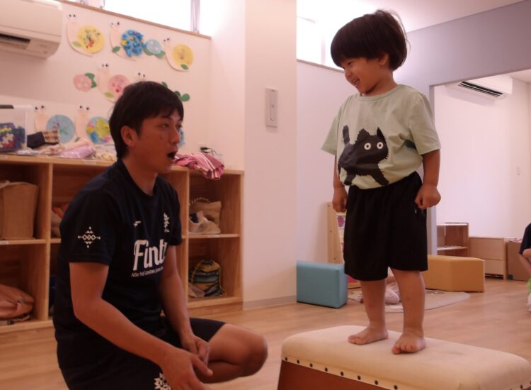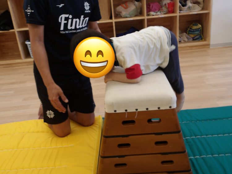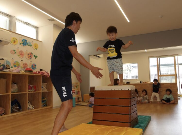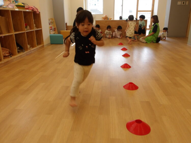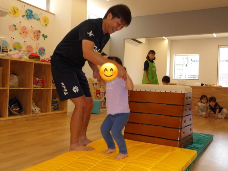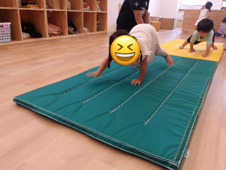 上に乗ってマットの上へジャ〜ンプ!みんなあっという間ににクリアです。そして2段、3段・・・どんどん飛び箱は高くなり、増えていく度に「キャーーー!」と声をあげつつも挑戦意欲を掻き立てられワクワクしながら挑戦していた子どもたちです