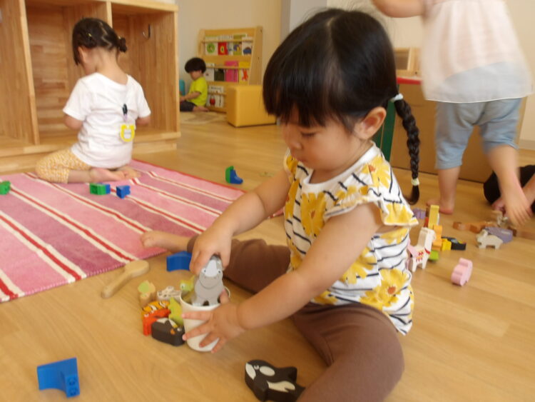 同じ動物のおもちゃでも入れ物に入れることを楽しんだり、積み上げて楽しんだりと遊び方も違います![]()