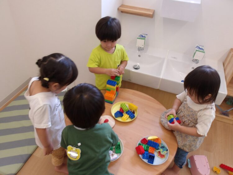 お皿の中にブロックを入れてお料理を楽しんでいるお友達です![]()