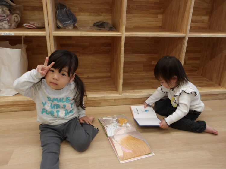 新しいお友だちと一緒に絵本読んでるよ!!仲良しだね!