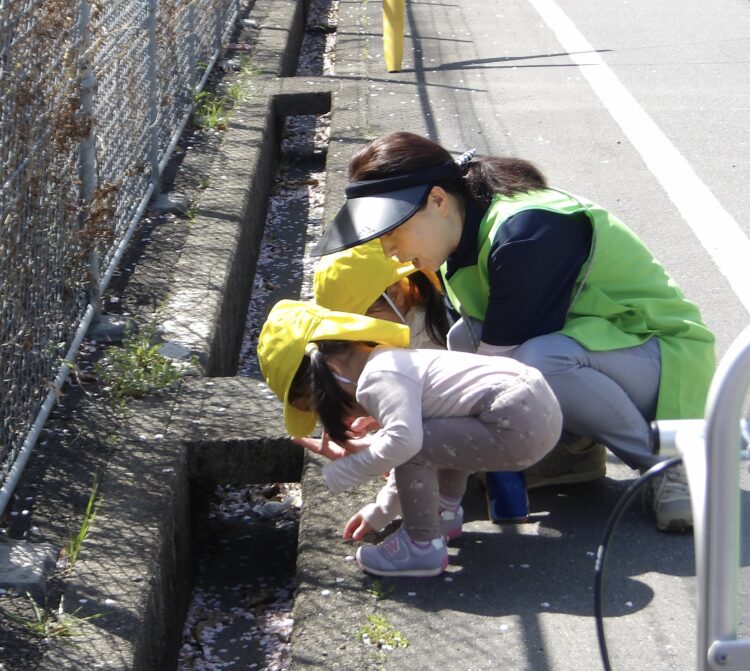 道端に落ちている桜の花びらを発見し、興味津々!![]()