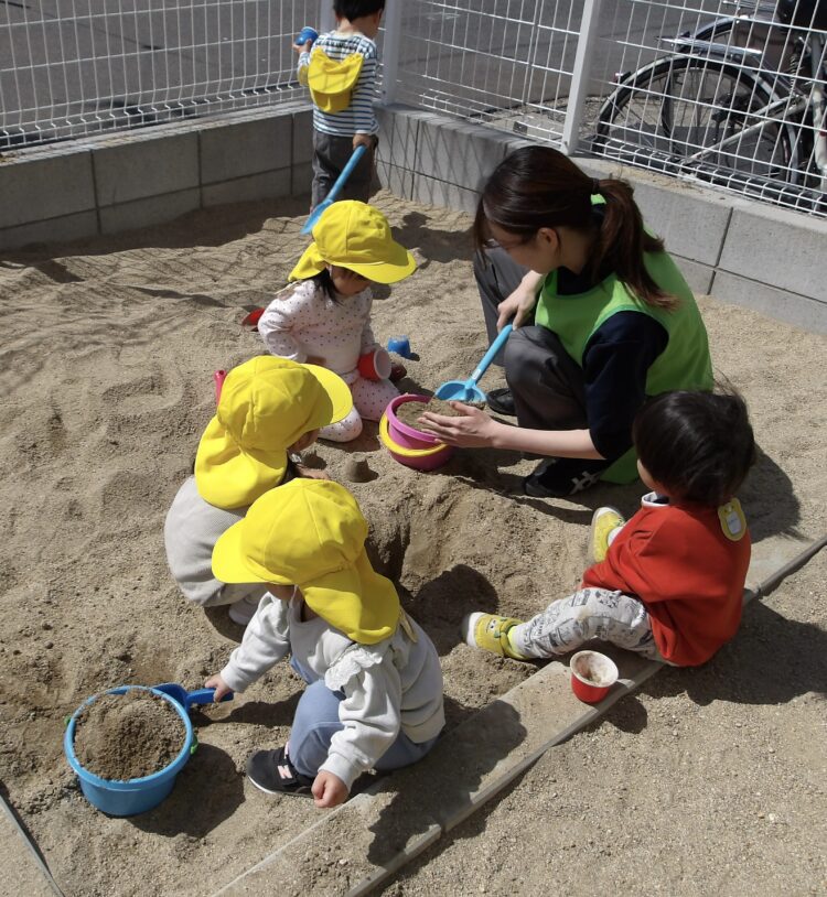 保育士の「お外に行ってあそぼうか〜!」の誘いかけに「やったー!いくいく〜!!