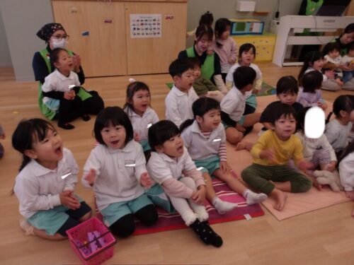 サンタさんが登場すると、声を上げて驚くお友だちやびっくりして固まってしまうお友だちもいました😄