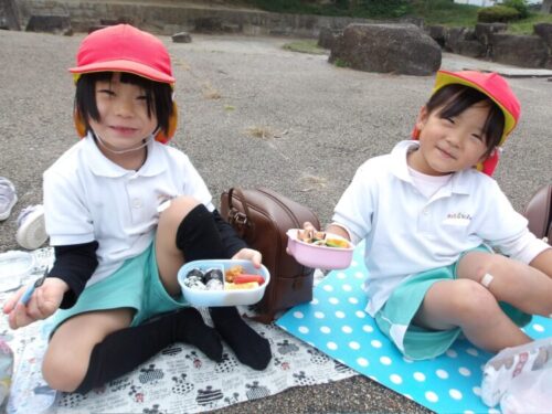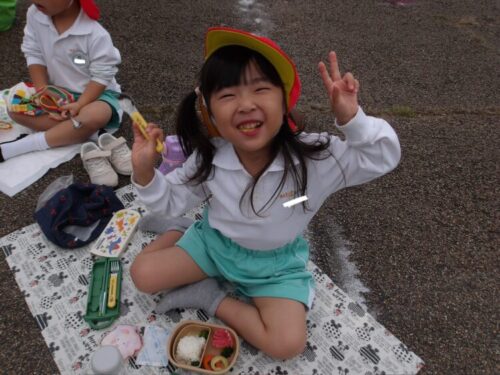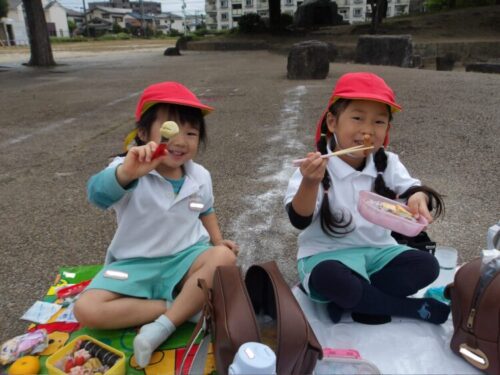 「唐揚げ入ってるー!卵焼きハート!みてみてー!」とお弁当箱やレジャーシート、お弁当の中身を嬉しそうに出して見せ合いして楽しくお弁当タイム🎶