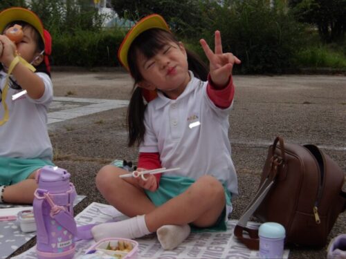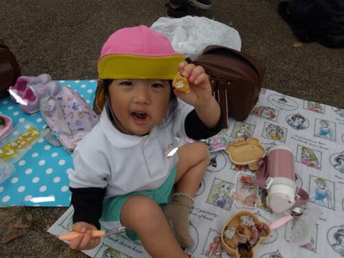 「お弁当の時間だよー!」の声でみんな「やったー!」と走ってカバンの元へ!