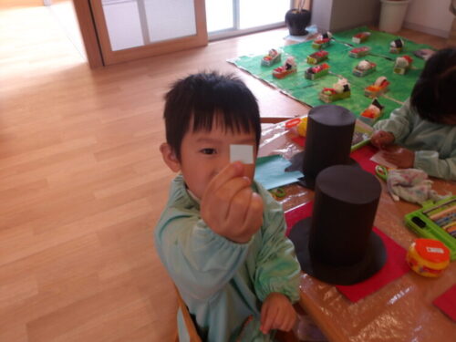 四角に切れた!三角に切りたい!と好きな形に切って貼っていましたよ😄