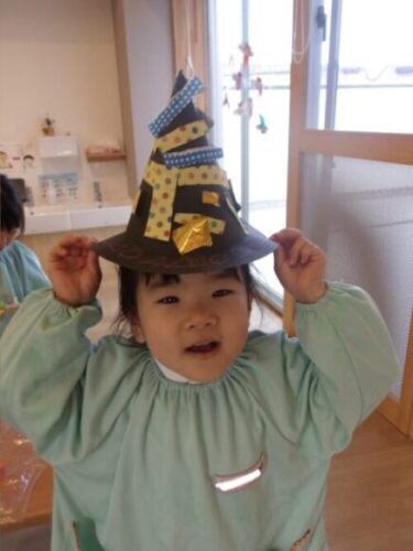 折り紙、毛糸、クレヨン、シールを使ってオリジナル帽子を作りました👒