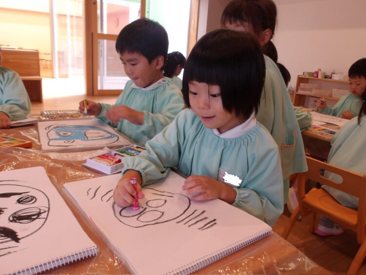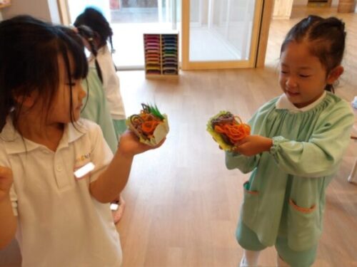 その後は好きな具材をそれぞれ作りウインナーの顔やハンバーグの焼けた跡などそれぞれ考えて描いていましたよ😄