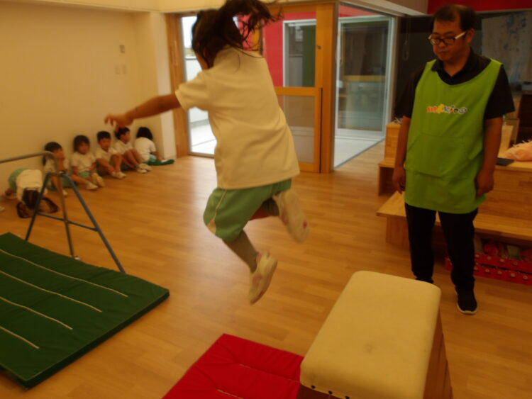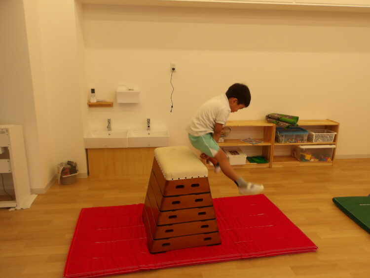 跳び箱ゾーンで、一人開脚跳びにチャレンジする年長さんは、みんながおままごとやお店屋さんごっこに家族ごっこを始めても…ずぅ〜っと、額に汗が滲むまで跳び箱チャレンジに励んでいました。