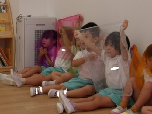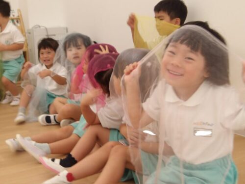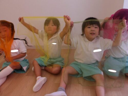 と子供たちも講師の先生と一緒に歌いながら、スカーフを使ってリトミック遊びをしたり、