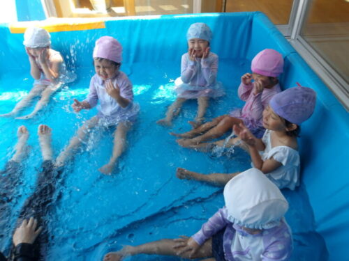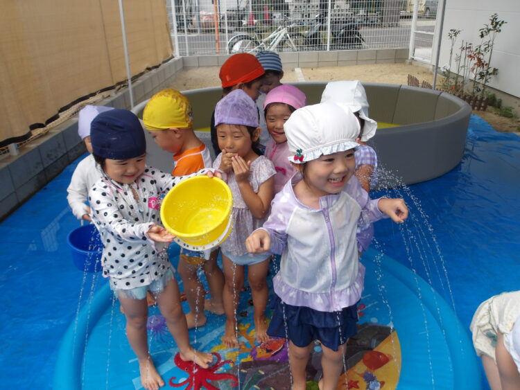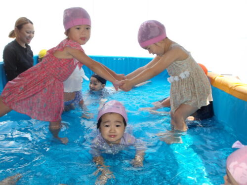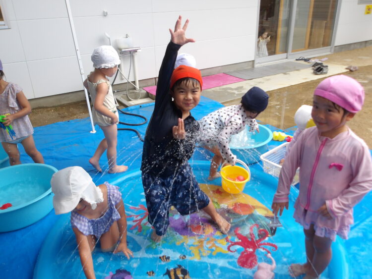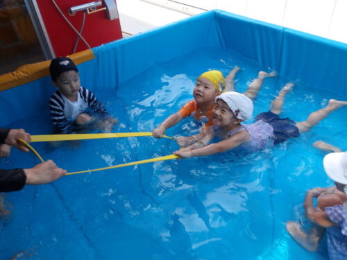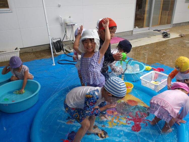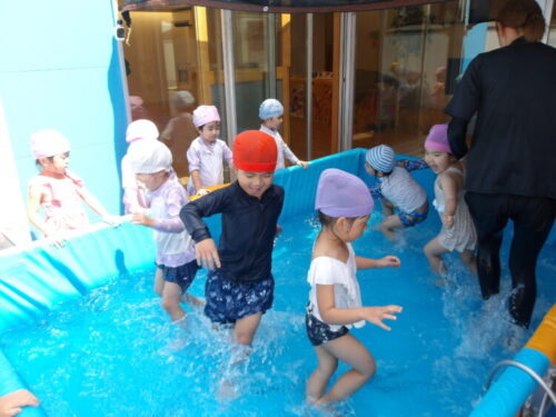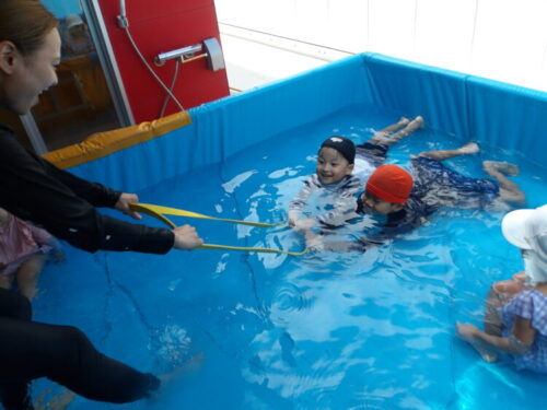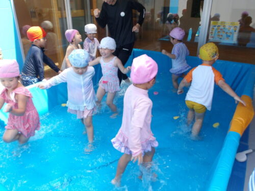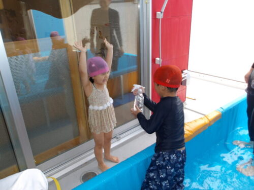 今日の水遊びではトンネルやりたいというのでお友達とペアで手を繋いでトンネルを作ってもらいました😄