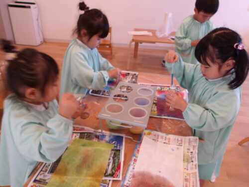 茶色ができればチョコレート🎶と言って見せてくれたり、オレンジは赤と黄色だよ!と言って、色作りを楽しんで作っていましたよ😄