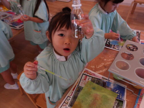 スポイトを使った色水遊びでは、「泡ができた!🫧」と大はしゃぎ