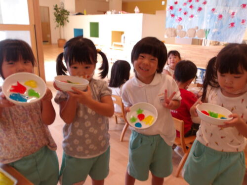 色とりどりのグミをサンドイッチのように挟んで一緒に食べて、いろんな味を一度に頬張る子もいたり、上手に型抜きできたグミを小さくちぎりながら、一口一口味わいながら食べる子もいたり、食べ方も十人十色😋