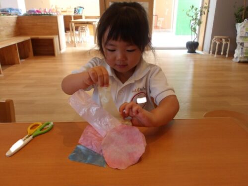好きな色のスズランテープをつけてさくのもテープで止めてるので取れないように力加減を考えて上手にさけていました😊