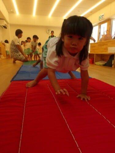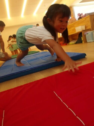 前の子が前回りをして、褒められているのを見ると、初めは抵抗していたお友だちも、勇気を持って前回りに挑戦していました!😁