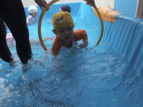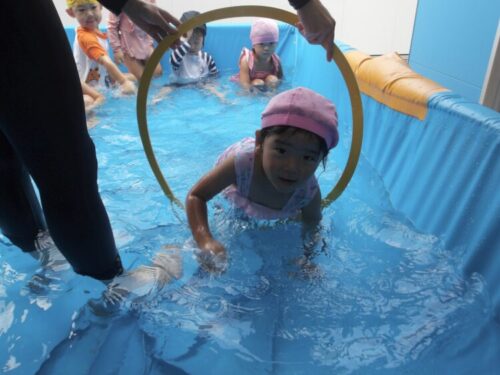 フープでトンネルを作り、イルカショーのイルカさんはここをジャンプするのを思い出しお話ししてみんなもイルカ〜🎶🐬言って泳ぎながら潜る遊びも楽しかったです😆