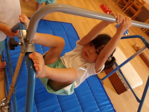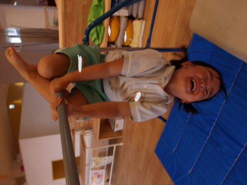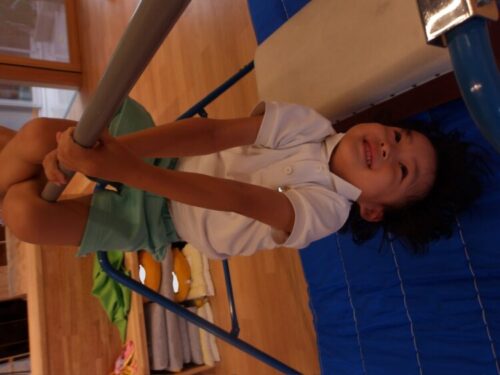 今日は鉄棒を出してみると、前り回り、豚の丸焼き、コウモリポーズなど、好きなぶら下がりチャレンジをして楽しんでいましたよ!