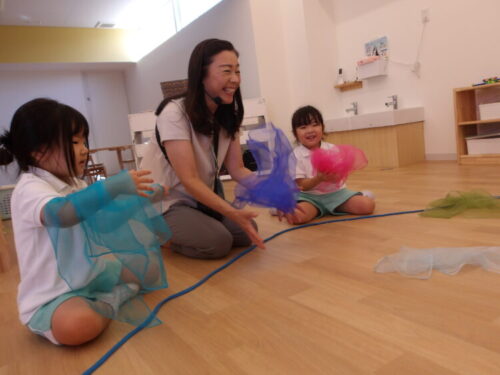 スカーフを水(海)に見立てながら音を聞いてザブンザブンしたりツンツンしたり、音が変わるタイミングで楽しそうにスカーフを揺らしてました😄
