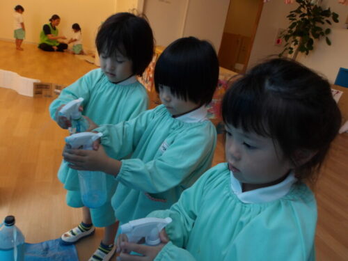 今日は水遊びができなかったのでお部屋で霧吹きと色水を使った遊びを行いました😄