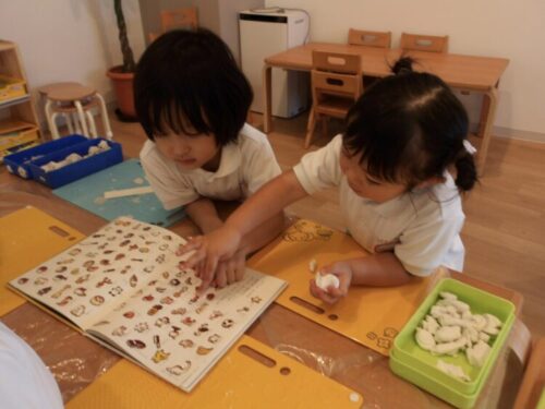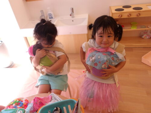 赤ちゃんやぬいぐるみのお世話をしたり、制作コーナーではパンを作るろう!という声が聞こえたので、絵本を出してあげるといろんなパンを見ながら作ってました😄