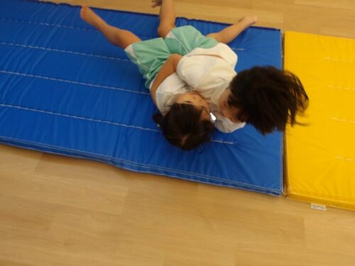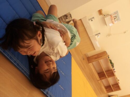 初めてお友だちとくっつきながら回転するマット運動に挑戦しました!