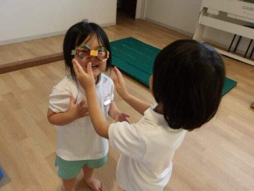 ブロックでメガネを作って、かけて遊んでました😂
