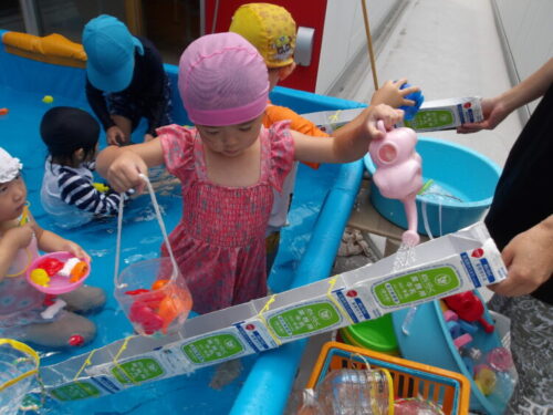 乳児さんが使ってたおもちゃを借りたり新しい滑り台を取り入れると、おもちゃや水を流して楽しく遊び込んでいましたよ😄