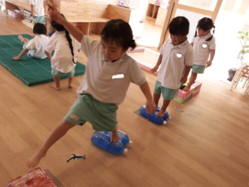 落ちたらサメに食べられるよー!と言う声が聞こえてきたので、魚釣りで使ったサメを置いてイメージしやすいように取り入れると、子どもたちも落ちないようにさらに緊張感を持ちながら、渡って進んでいましたよ😄