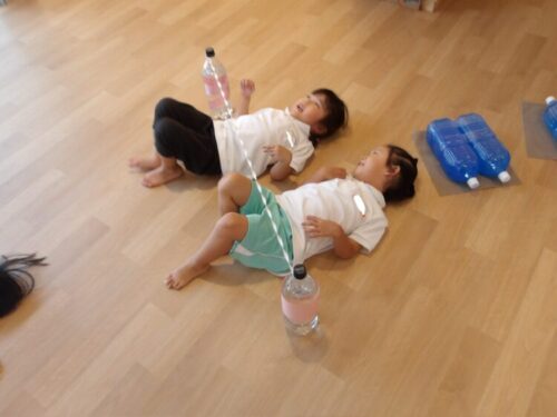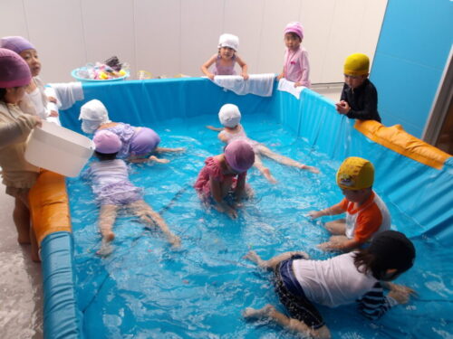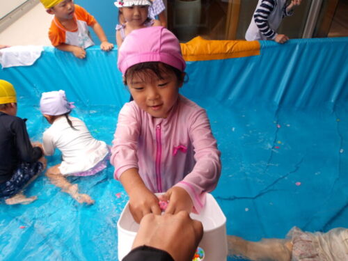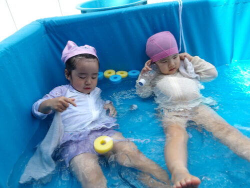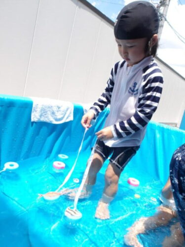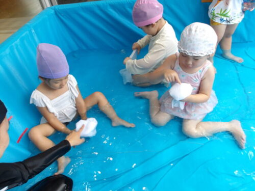 水で浮かぶラッコの泳ぎをして水風船を食べ物に見立てて遊ぶお友達もいましたよ😄🦦