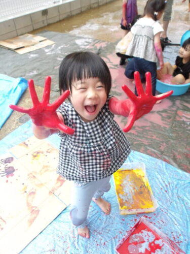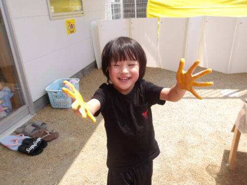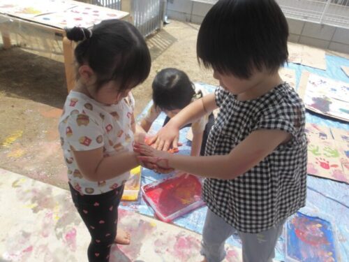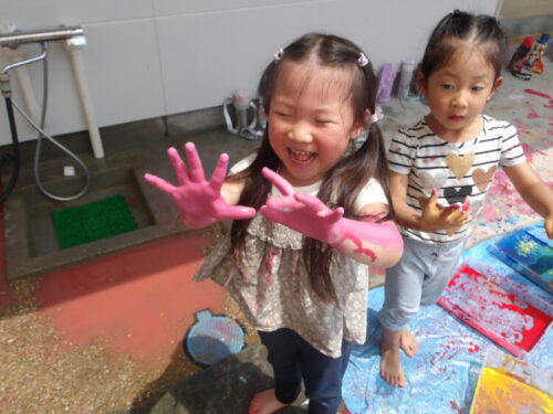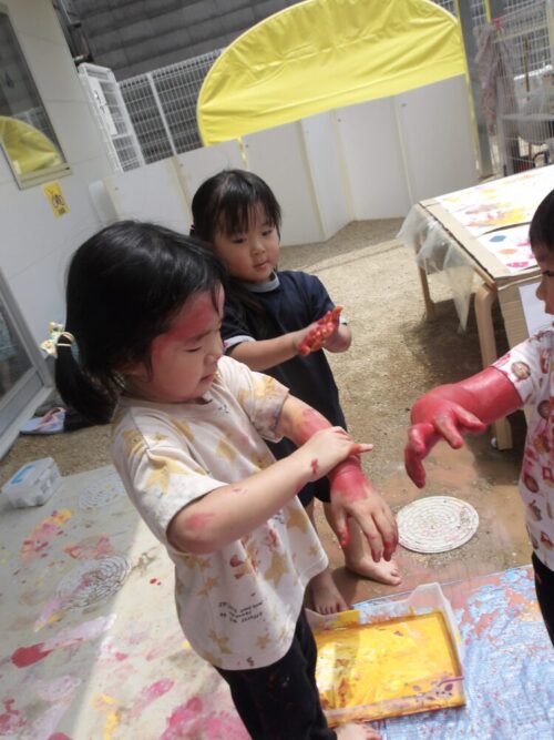 腕などにも塗って絵の具の感触を感じながら、友達同士ぬりあいもしてましたよ😄